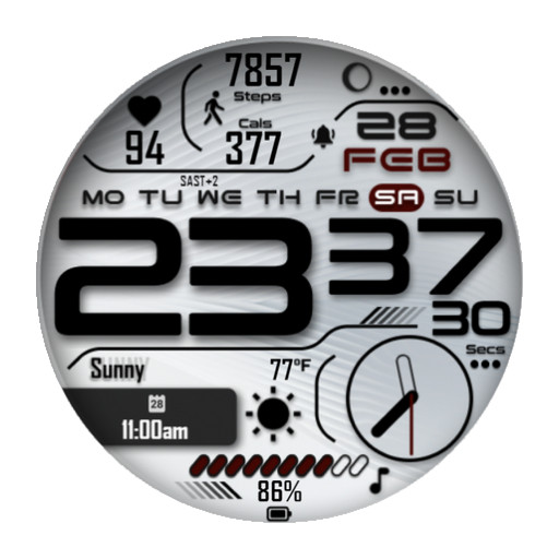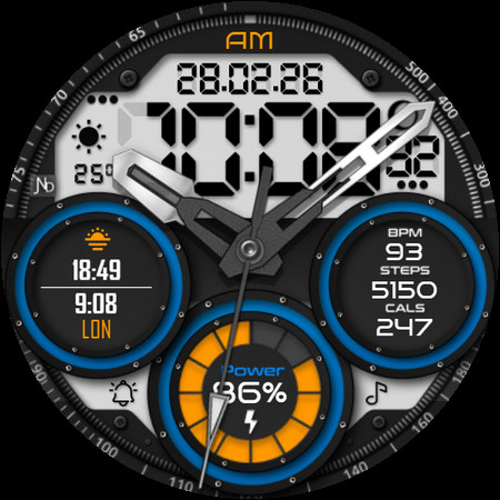 The JND0056 is a bold looking hybrid watch face with large digits an OLED friendly stylish design and clear analog hands. Digital time is offset and analog hands are in original position. High quality and detailed looking face. Enjoy and have a great 2025.